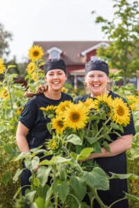 Johanna och Elin Andersson utanför bageri, där gårdens ägg förädlas till  framförallt glass. Solrosorna odlas till förmån för Barncancerfonden.